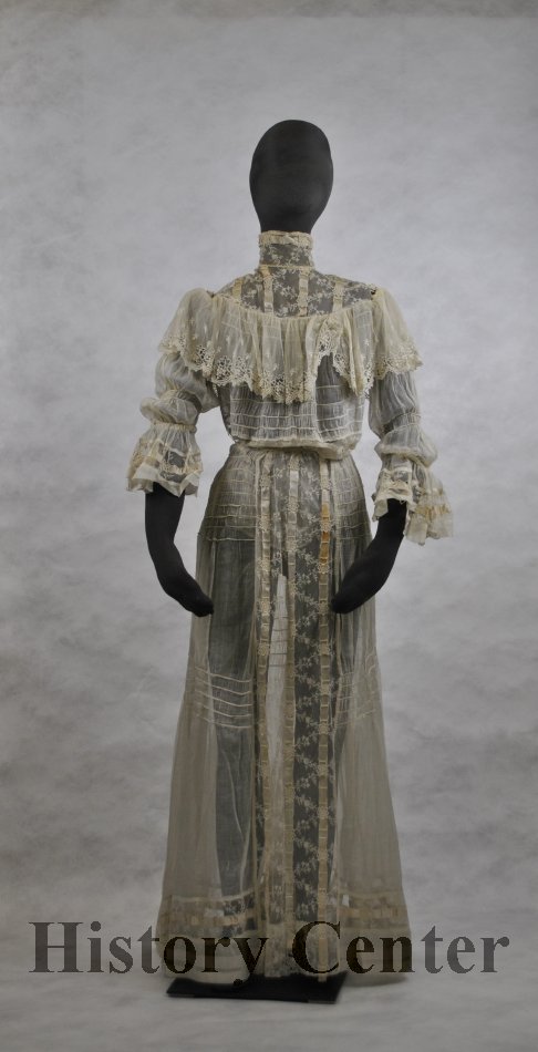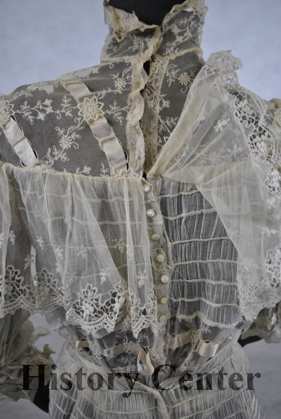 Two piece woman's white organdy dress with full skirt with panel on center front of skirt is trimmed lace and net through which is woven a white satin ribbon; a similar panel of lace, net and ribbon runs around the bottom of the skirt. Blouse has vertical gathers and tucking both front and back, running through center of garment; at both top and bottom of tucking are strips of net, lace and ribbon as on the skirt; blouse has small lace collar and a 6" piece of gathered net and lace falling from the shoulders giving the effect of a small cape; sleeves are three quarter length and trimmed at the bottom with a flounce of net, lace and ribbon; buttons down back with small pearl buttons.