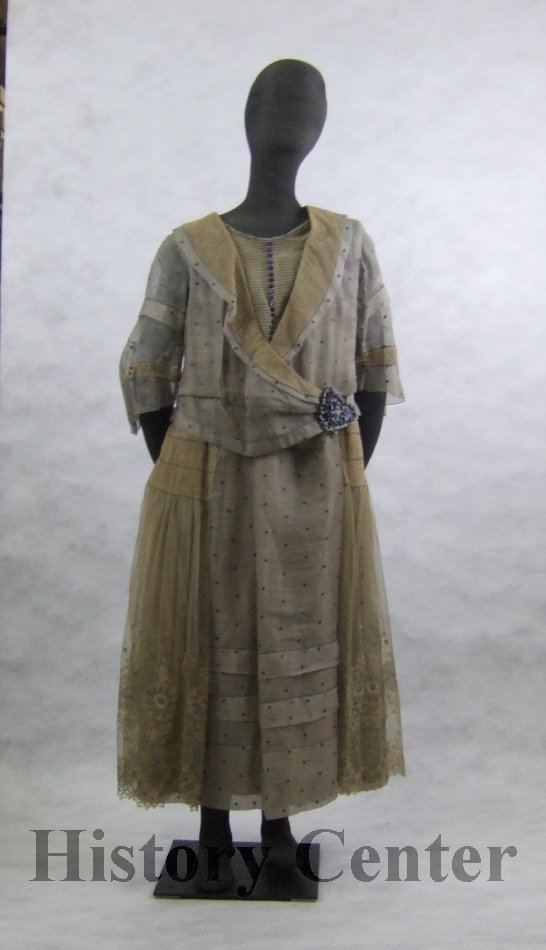 Pale blue organdy dress with darker blue embroidered dots, trimmed with tucked net.