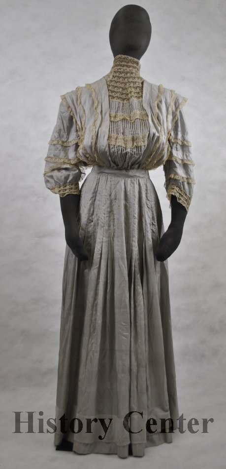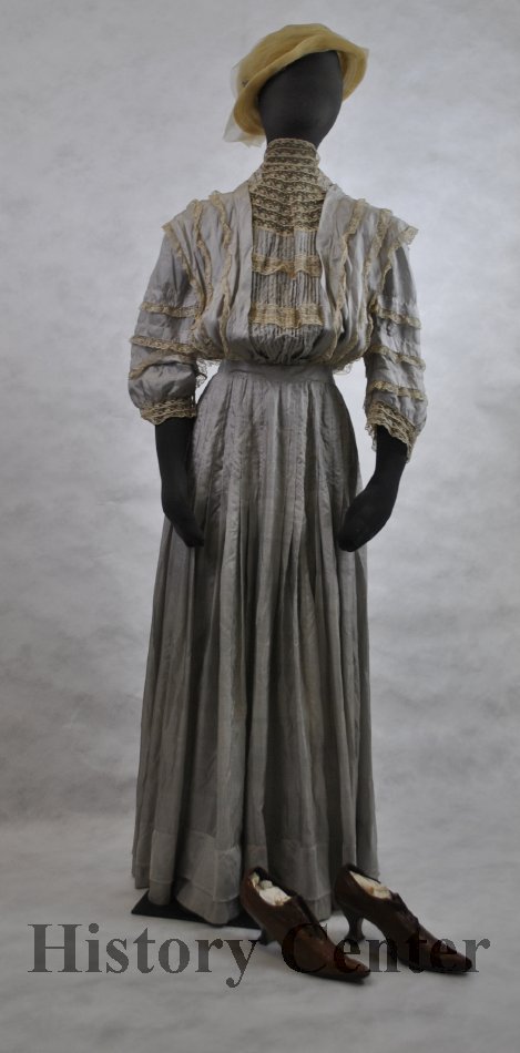 Woman's dress of light gray silk with darker grey stripes and lace trim; pleated from waist; back closes with hooks & eyes. Bodice has insert which is pleated, the rest of the bodice is layered to give the impression of a shirt waist. Sleeves are straight but slightly puffed at the hem. Skirt is pleated from the waist.