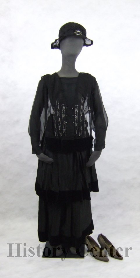 Woman's black horsehair hat with sheer black fabric lining; three pieced designs on front; plastic hatpin with rhinestone pinned to black ribbon hatband. Belonged to Emma Mossman (1875-1948).