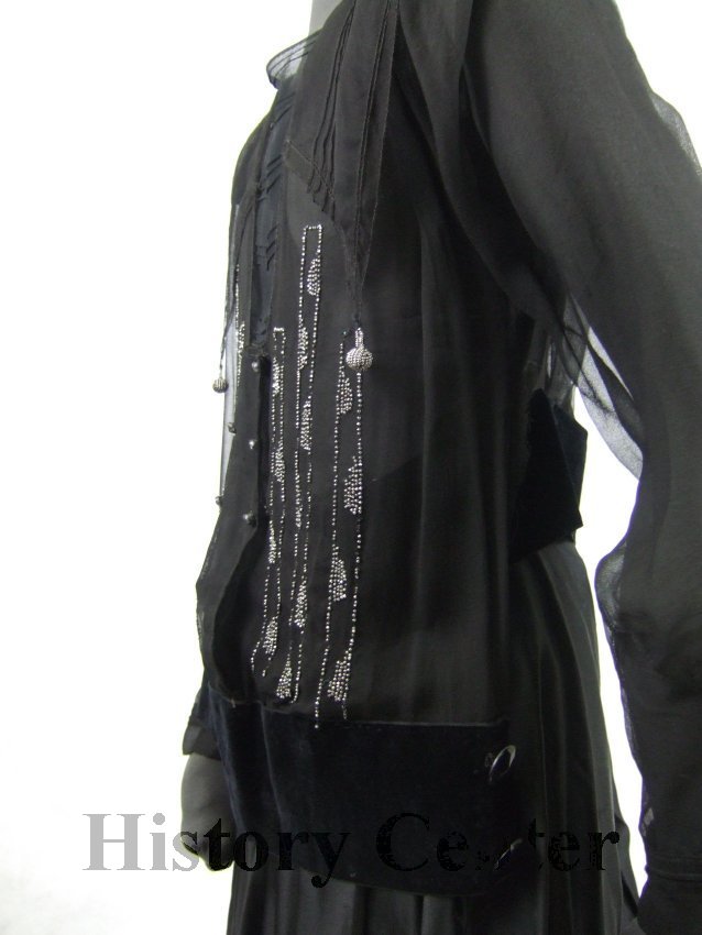 Woman's two piece outfit with black silk skirt in two tiers, each trimmed with three inch black velvet. Bodice is of black chiffon with three inch velvet at waist. Trimmed front and back with silver beaded balls. Wide collar over shoulders with silver beaded balls at each corner.