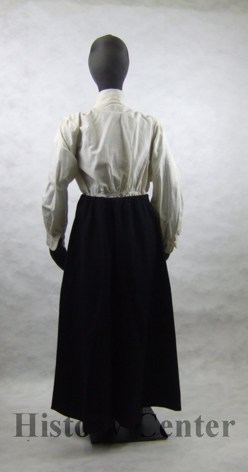 Skirt of dark blue wool serge; ankle length, flaring at hem line; center front has vertical stitched pleat, or simulated fly front, with patch pockets on either side; placket at left side with snap fasteners; waistband of webbing.