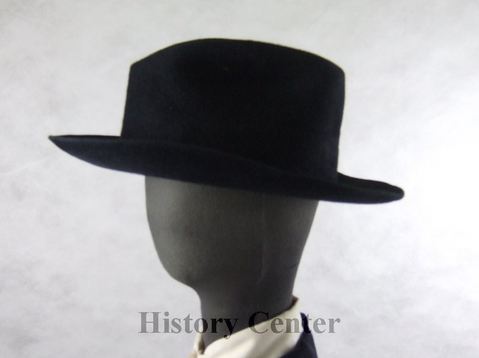 Hat of black felt, resembling a man's fedora; crown about 6" high, brim approximately 2-3/4" with no outer or inner band.