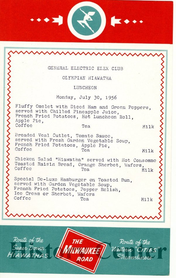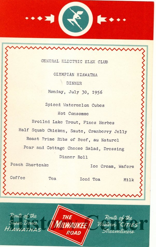 The menu is from the General Electric Elex Club Olympian Hiawatha Breakfast, Luncheon and two Dinners. According to Clovis E. Linkous' book, the Elex Club started in 1915 when the women of the company organized a sports team. The team did not last but the name did. Elex is short for the Greek word "elektron" associated with an electrical charge. The menu color is red, white, and turquoise. There is a Native American figure at the top of the page and a label at the bottom that reads "The Milwaukee Road"