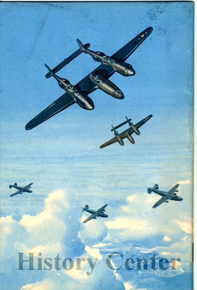 The magazine is information about the General Electric Turbosuperchargers. The front and back is a continuous picture of American WWII planes flying above the clouds. The contents of the magazine have stories and pictures about the invention and use of the new turbosuperchargers.