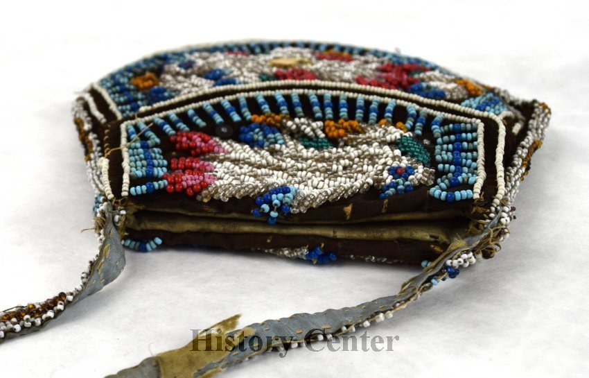 This purse was created by Kilsouquah around the time of her 100th birthday. It is made of velvet and is heavily beaded in crystal as well as white, blue, red and green glass beads.