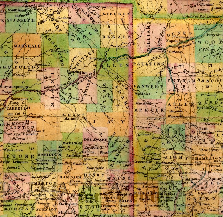 Fort Wayne was chosen as the site for the groundbreaking of the Wabash and Erie Canal in 1832 be-cause it was the highest point along the route, dubbing Fort Wayne the "Summit City." When the canal finally connected Toledo to Evansville in 1853 it stretched 468 miles and was the second longest manmade waterway in the world. This two-dollar bill is from the Wabash and Erie Canal Land Office. It is dated 16 August 1842, nearly one year before the canal was dedicated in Fort Wayne on 4 July 1843 for completion of the canal from Lake Erie to Lafayette. These bills were first issued in 1840 and were intended to be used for paying interest and principal due on canal lands. Eventually, several versions of this land scrip emerged. Laborers who were paid in this currency received less for their efforts and much speculation occurred in the hopes that the currency would rise in value.