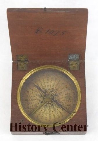 The compass, set inside a wood case, originally belonged to Captain Asa Fairfield. Fairfield was raised in Maine and commanded a ship during the War of 1812. After moving to Fort Wayne with his brothers in 1835, he became a civic leader, farmer and landowner. He was the first person to operate a canal boat, named the "Indiana," on the Wabash and Erie Canal. Much of the South Wayne area was for-merly part of a farm owned by Asa Fairfield. Pictured here in a daguerreotype image is Captain Fairfield and his wife Olive Stone Fairfield, who was a cousin of Hugh McCulloch.