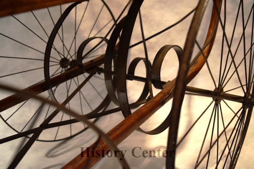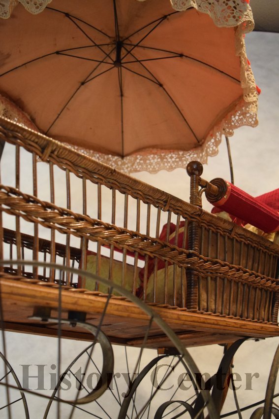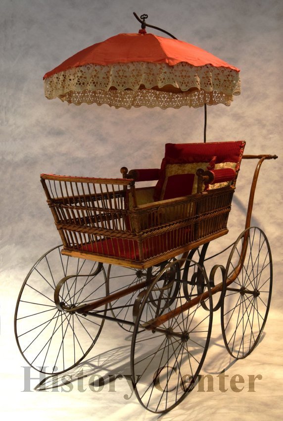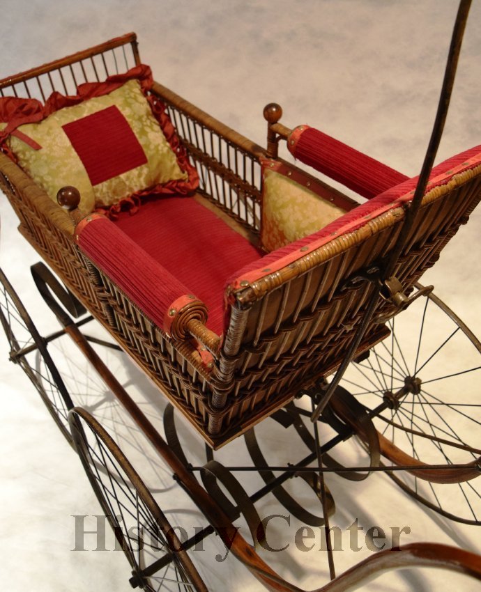 Raising a family has always been part of community life. While baby carriages were used as early as the 1700s, the modern stroller was first patented in the 1880s. The development of independently moving wheels aided mobility and maneuverability. The carriages were built of wood or wicker held together with expensive brass joints. This baby carriage first strolled down Greeley Street in Fort Wayne in 1888. While the interior fabric of the carriage was restored in 1971, the umbrella fabric remains true to 1888. This carriage style was advertised in the Fort Wayne Gazette 28 April 1893 (page 7) by the Indiana Furniture Company on Calhoun Street as "A Bargain. Full size Reed body finished, Globe gear, steel wheels. Upholstered in Damask, with silk, plush roll at back in assorted colors."