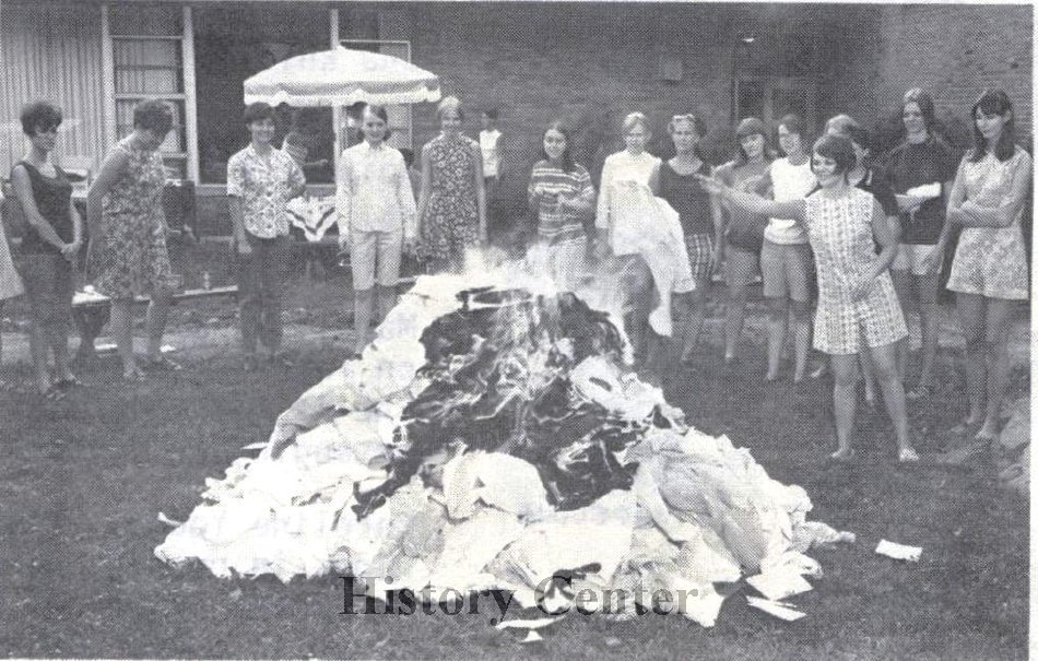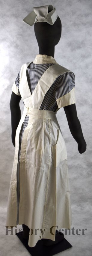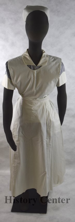 In 1949, the School of Nursing changed their uniforms from an all white dress to a blue and white striped blouse, a white skirt (that was to fall one inch below the kneecap), a white bib apron and a white cap. This style was last worn by the graduating class of 1969, which presented the Historical Society with this uniform. Presumably few others survived as the ladies burned the rest at the traditional burning party on the lawn behind English Hall.