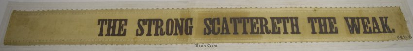 On 22 March 1823, John Sheets, grand master of the Masons of Indiana, granted a dispensation to Alexander Ewing, worshipful master (the most senior officer), "together with all such brethren who might thereafter become members" to form a lodge. After gathering many influential men from Fort Wayne, Wayne Lodge No. 25, Free and Assembled Masons Society, received its charter from the Grand Lodge of the State of Indiana on 10 November 1823. This was the first such society organized in Fort Wayne.(38) This Masonic apron and sash were used in rituals. The sash was found folded up inside the pocket of the apron and warns "The Strong Scattereth the Weak." The apron is white cotton printed with several Masonic symbols in black. One hundred years later, the eight-story Masonic Temple built in 1923 still stands tall and proud on Washington Street today, a symbol of historical continuity.
