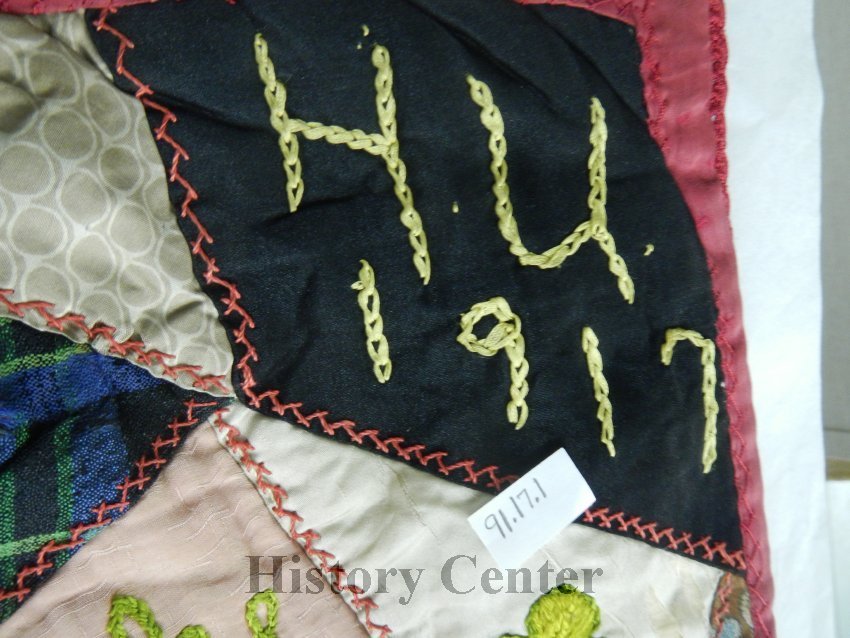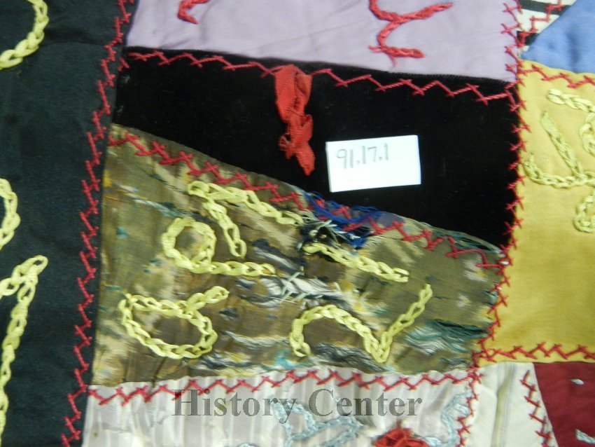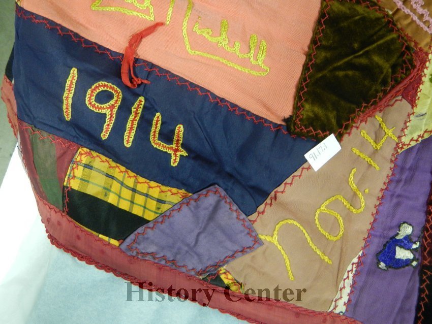 Towards the end of the nineteenth Century, Fort Wayne's population was rapidly growing and the city became more dense and industrialized. With expanded transportation options, including the electric trol-ley service available by 1892, residents began moving to the "suburbs." The first subdivision in Fort Wayne, Lakeside Addition, was platted in 1890 and offered larger landscaped lots only minutes from downtown. A "Friendship Quilt" is made by several quilters with each friend or relative contributing a block for the larger project. This quilt belonged to Katie A. Weiler and contains names of friends and relatives, many from the Lakeside area, who contributed to the quilt from 1914 to 1917. This particular quilt is also an example of a "Crazy Quilt," made with a patchwork of different sizes, shapes, colors and fabrics.