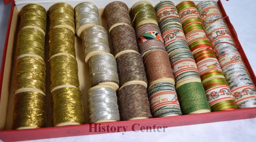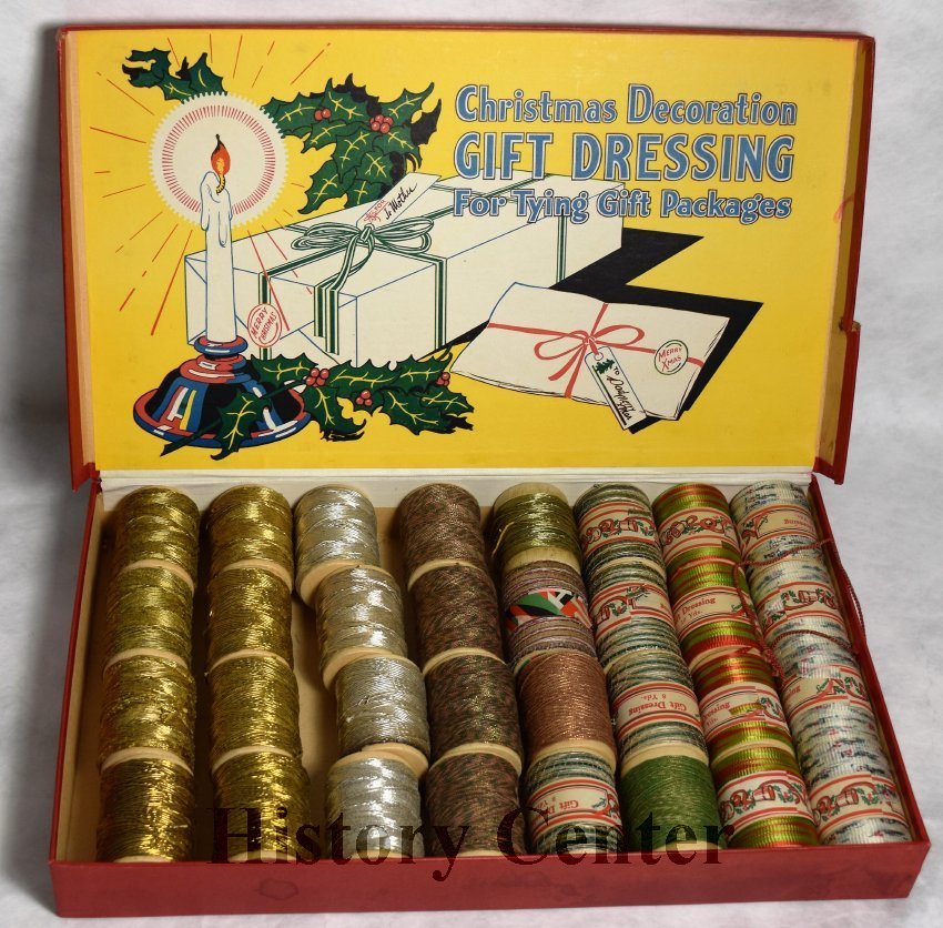After the Dudlo Manufacturing Company laid the ground work to make Fort Wayne the future magnet wire capital of the world, it moved into the production of tinsel, the tiny gold and silver threads that lend much charm to Christmas decorations. Although European tinsel dominated the market, Americans began experimenting with producing tinsel in the late nineteenth century. Fine wire was flattened between two highly polished rollers into a very thin silver or gold ribbon. While Dudlo was manufacturing wire that opened new horizons for electricity and electronics, the Leonic Division of Dudlo was organized in 1916. The success of this new division was gradual; in time, Dudlo's Leonic Division became recognized as a serious contender in the American tinsel market. Dudlo's expansion into tinsel production exemplifies the diversification that reflects the development of Fort Wayne industry as a whole. This department store counter display holds thirty-two spools of tinsel and ribbon for gift wrapping Christmas packages. The red box opens to reveal festive images of a Christmas candle, holly and gifts. The shiny assortment of tinsel was sure to delight every gift recipient.