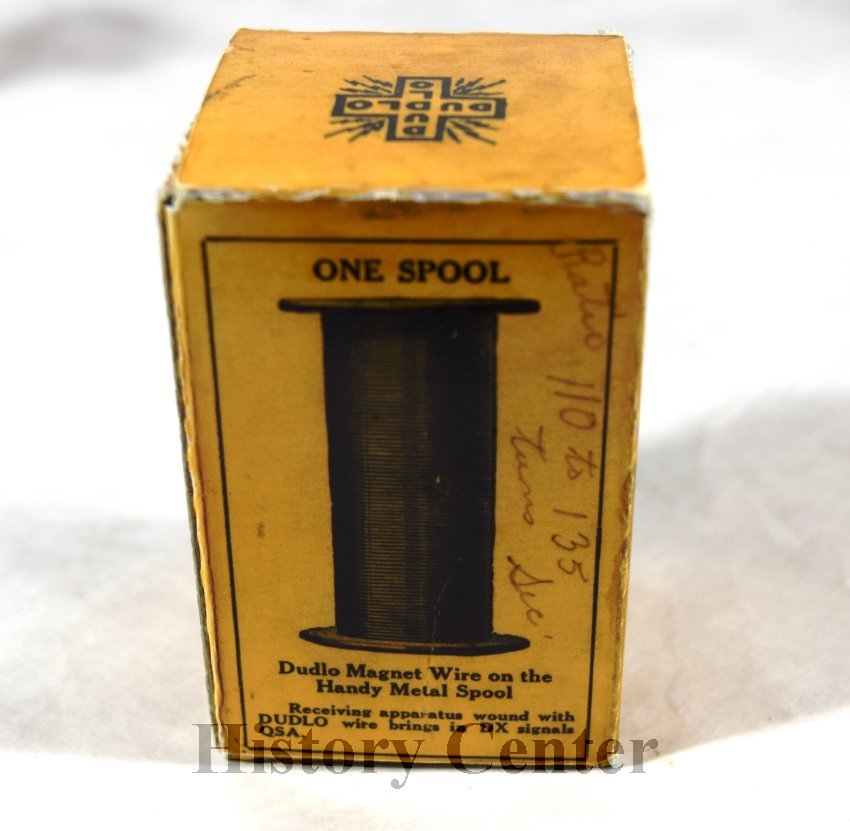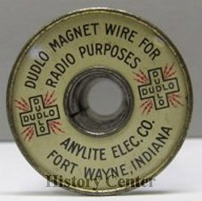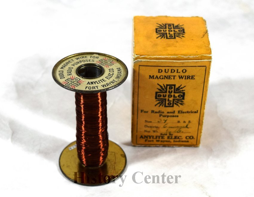 An improved method for making magnet wire-insulated copper wire wound into coils to create electro-magnetic fields-was developed in Fort Wayne, an innovation that fostered local industries to such an extent that Fort Wayne became known as the magnet wire capital of the world. Without magnet wire, electrical devices, such as motors, television, computers, and automobiles would not be possible. George Jacobs formed the Dudlo Wire Company in 1911 with William Mossman and his son, B. Paul Mossman. He perfected a chemical enameling that had been a large problem for General Electric and other companies; the insulating process allowed wire of any thickness-especially fine wire-to be coated evenly with a chemical insulation that could be baked on and yet remain flexible enough to be wrapped into coils. It was a great improvement on the former process of wrapping wire with fabric. This process was used by Dudlo through World War I and into the 1920s. Essex later acquired the company plant and for a time Essex, Rea Magnet Wire, Phelps Dodge and General Electric in Fort Wayne were producing ninety percent of the magnet wire in the United States. The small wire spool, with its original box, still contains Dudlo manufactured wire. The Dudlo logo with red lightning bolts appears on the ends of the spool. This particular type of wire would have been used in radios.