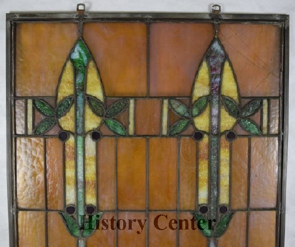 This section of stained glass was a window from the Homestead. The background pieces are pink and amber blended together. At the top there are two floral sections with green leaves and sections of am-ber and white blended; near the middle are more green leaves. The leaded glass window may have been used to light a stairwell, because the piece is so narrow. A metal frame has been secured around the glass to help stabilize the piece and hooks have been added to the back for hanging.