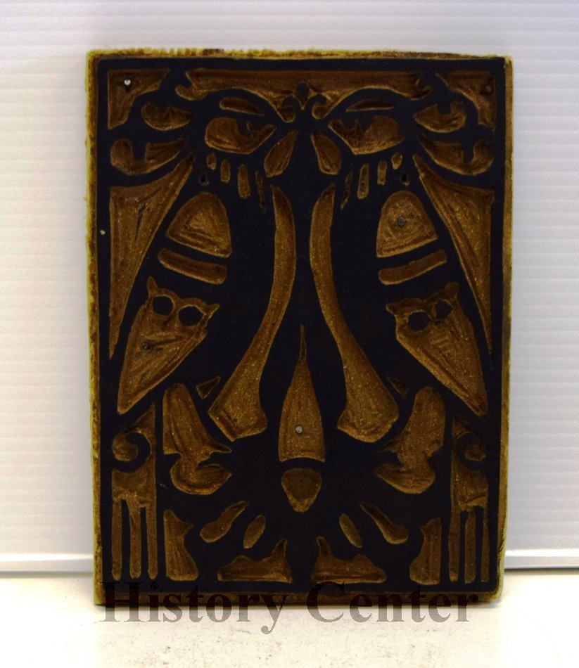 This 6-1/4" by 4-3/4" woodcut block was created by Esther Freese about 1910 at the first art school in Fort Wayne. Ink was applied to the block and pressed on paper to make a print. The image of two birds, blackened with old ink, has been carved out of the wood. It is attached to a very light wood and is nailed down to a backing board. Miss Freese (1892-1987) was a local teacher at Harmer School for many years.