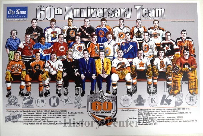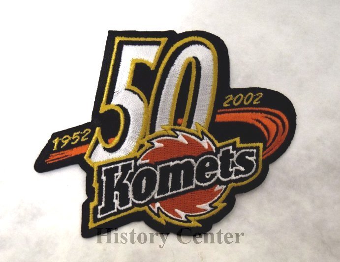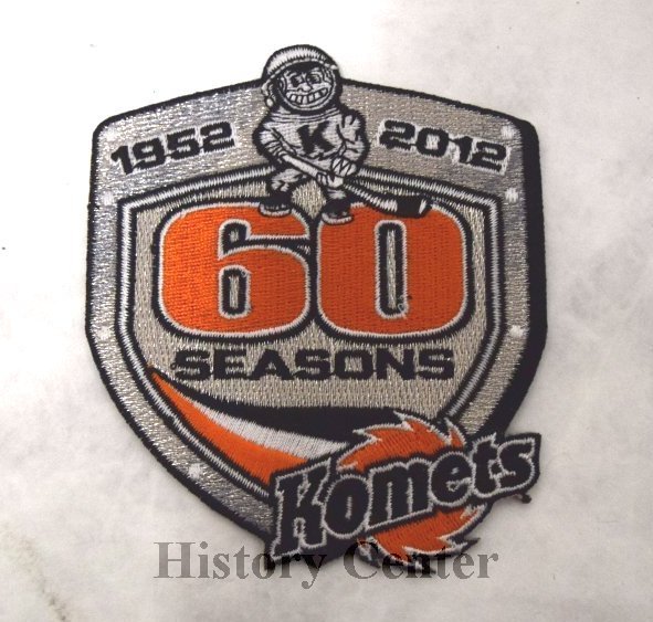 These two patches celebrate respectively fifty and sixty years of Komets Hockey. In 2002, the play-ers wore this 50th anniversary patch. The patch is black with a big, white "50" above the familiar orange, black, and white Komets logo. In 2012, in addition to the 60th anniversary patch, this poster featured the likenesses of twenty-nine Komets "all-stars" from the past sixty years as well as many of the vintage jerseys.