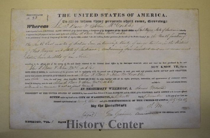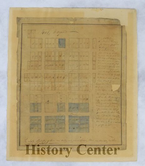 In the Treaty of St. Mary's of 1818, the Miami Indians ceded their claim to a large amount of land to the United States and in 1823 the federal government agreed to open a land office in Fort Wayne and allow the city to be platted. This "Original Plat" of 118 lots over 109 acres became the basis of the emerging town. Bounded by the present streets of Barr, Washington, Superior, and the alley between Calhoun and Harrison, the streets were laid out parallel to Columbia Street-not in a true east-west compass direction. The plat also included a public square with Court Street as its eastern boundary. With the exception of Water Street, which has since been changed to Superior, the streets in the Original Plat retain the names given them in 1823.