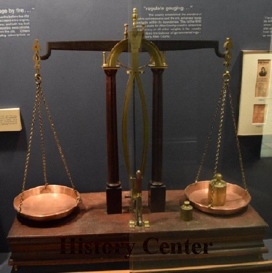 The large scale featured here was a test scale from the 1840s. Throughout the 1840s, it was used in the Allen County Courthouse to set the standard to which all other weights were compared for use in commercial transactions.