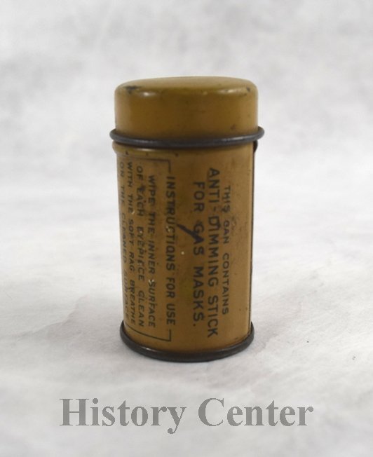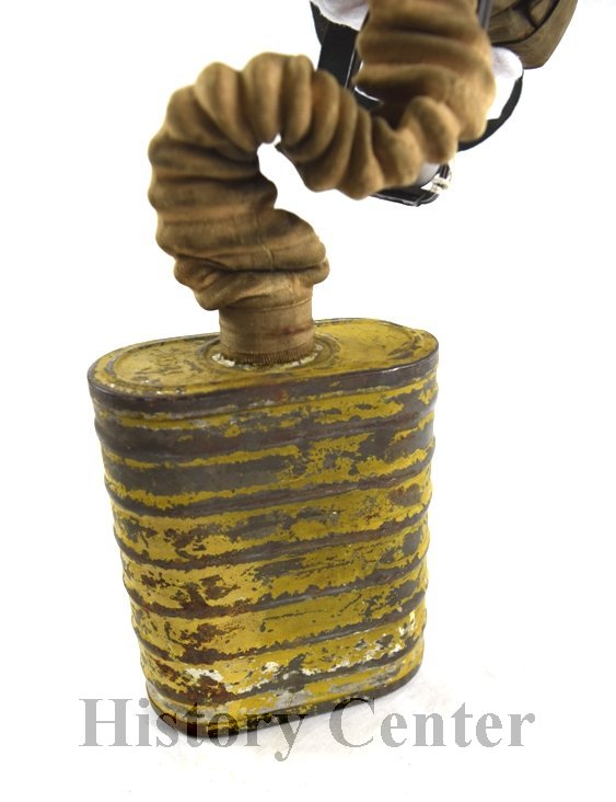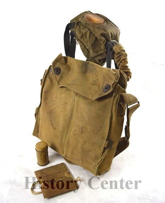 This gas mask is in the style used by American Expeditionary Forces during World War I-a face piece and metal canister connected by a fabric and rubber accordion hose. A bag was used for carrying the mask and canister, in addition to anti-dimming composition (for cleaning the mask lenses) and an in-struction booklet. A soldier would wear the mask and hang the bag containing the filtering canister around his neck, leaving both hands free. Toxins were reduced by absorption in the charcoal filter within the canister, protecting the lungs when air was inhaled. Lenses protected the eyes, however, the mask did not protect the wearer from gas absorbed through the skin.