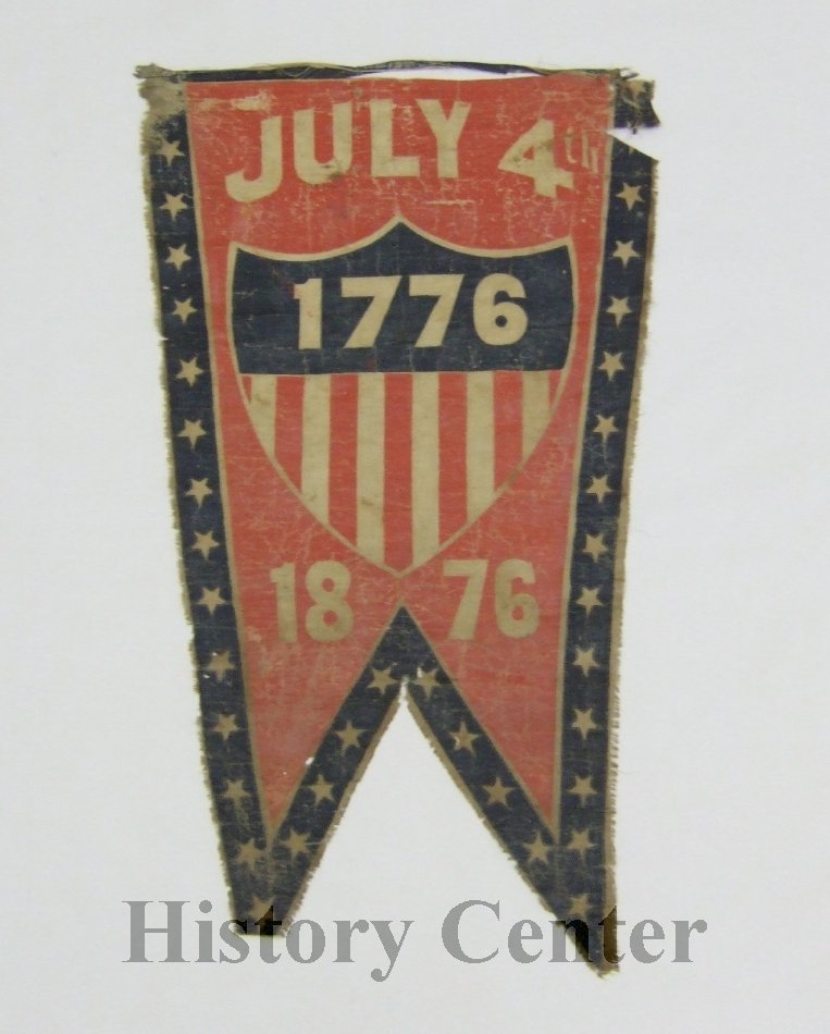 This souvenir banner was created in 1876 for display during the United States Centennial. A wooden rod at top allowed it to be hung vertically.