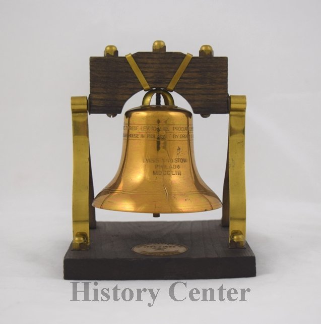This commemorative Liberty Bell is mounted on a wooden base with an inset collector's coin honor-ing the national sesquicentennial. Comprised of moving parts, the bell still rings today.