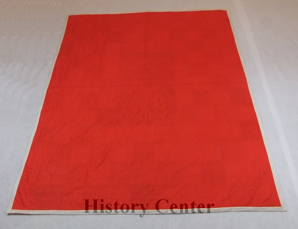 This quilt was made by Mrs. Deputy's third grade class of J. Wilbur Haley Elementary School as a United States bicentennial project in 1976. It features four rows of 5-1/4-inch squares. The center square is navy blue with white stars appliquéd with red yarn; "1776" and "1976" appear on the front in red with red yarn used around the numbers. The names of the children who made the quilt are around the outside border. The reverse of the quilt is red with a white border; stars and stripes are stitched in white thread over the field of red. The quilt is made of polyester-cotton blend material.