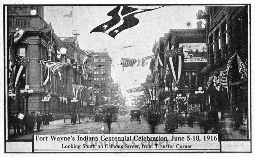 For the state centennial celebration in 1916, the Fort Wayne Centennial Association planned an exposi-tion celebrating the city's industry, featuring displays by two hundred local businesses, parades, displays and a grand pageant at Reservoir Park. Originally scheduled for 5 to 10 June, Centennial Week festivities were extended through 17 June due to rain.