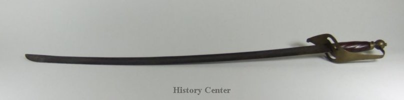 American Sword with brass curved guard and pommel, wooden grip with striped pattern, three fullers or blood grooves down blade.