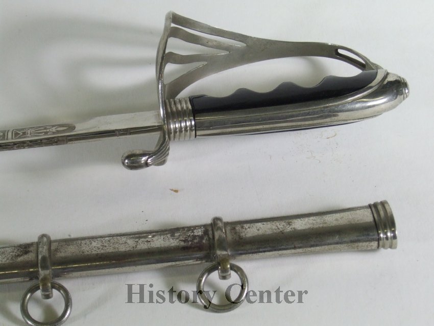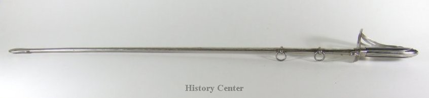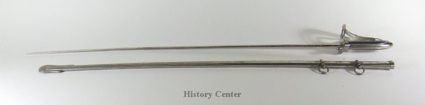 Saber with black grip and nickel guard with three branches; blade engraved "US" with eagle, "E Pluribus Unum." Nickel scabbard marked "The M.C. Lilley & Co. Columbus, O."; last type of sword used by U.S. Army, used by all branches of the service.
