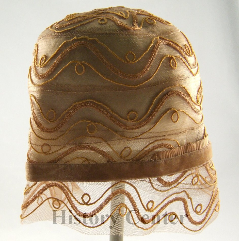 Tan net with gold braid and embroidery in circular overall design cloche. Tan grosgrain and tan velvet bands at base of hat, soft brim.