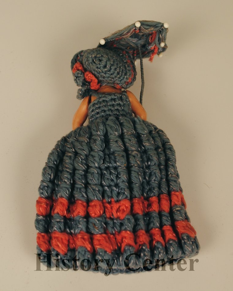 Celluloid Doll: blue crocheted dress with rose colored trim, bonnet, bag with faux flowers inside and parasol. Crocheted tight wool bodice, full skirt. Baby face and body. "France" impressed on back.