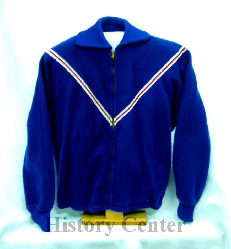 Blue Nylon; Red & White stripe forming a V to the zipper in front; writing in red w/ white striping on back; Elastic band at waist; Long sleeves; marked "Jacket for Champions; tailored by Butwin Champion of Jackets, Fort Wayne on back."