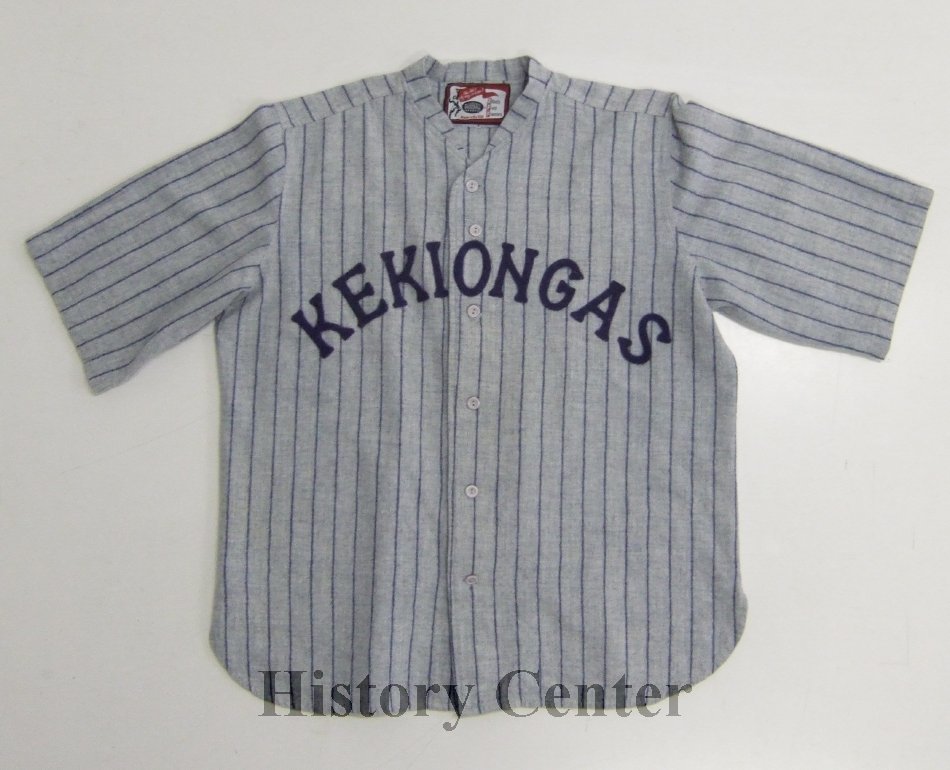 Light grey flannel short sleeved baseball jersey with navy blue pinstripes, button down front with six light grey/purple plastic buttons; "KEKIONGAS" in navy blue felt letters arch across chest and "20" on back of jersey; large rectangular tag at neckline in red and black with white background, picture of baseball player, "the HIT of any season! HISTORIC BASEBALL APPAREL EBBETS FIELD FLANNELS Made in the USA."