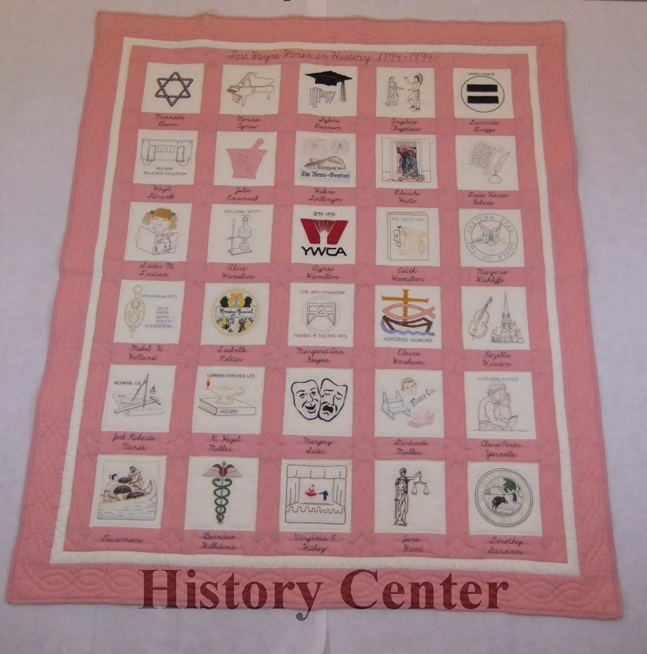 The American Association of University Women of Fort Wayne completed this quilt as a bicentennial project for Fort Wayne's bicentennial celebration in 1994. It represents the accomplishments of 30 women in local history. Women featured on the quilt include Helene Foellinger- owner of Fort Wayne Newspapers, Inc and publisher of News-Sentinel, Gertrude Muller- inventor, designer and owner of the Toidey Co., Inc. which made safety products for children like toilet and car seats, Tecumwa- Miami tribe leader, sister to Chief Little Turtle and mother to Jean Baptiste Richardville, and Dorothy Gardner- one of Indiana's first female deputies and the first female State Senator from Allen County (1947-57).