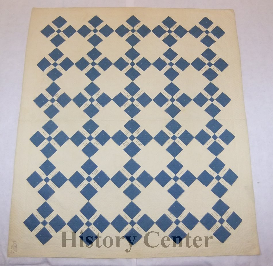 Made by the ladies of Bethany Presbyterian Church and signed by congregation members this quilt serves as a signature album and keepsake. It was made for the Reverend George E. and Mrs. Mabel Davies and given to them as a parting gift. Bethany Presbyterian Church was the Reverend's first congregation which he served at from his seminary graduation in 1894 until March 1899.