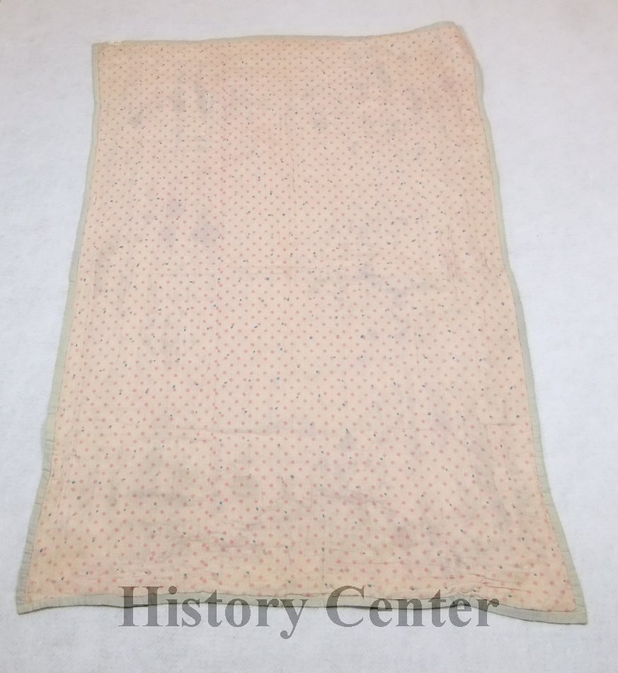 This quilt shows several different pattern blocks and may have been a way for the quilter to practice their skills. It includes a Tree/Pine Tree design, Baskets and a Nine Patch. At 53 3/4" L x 39" W this is sized to be a crib quilt.