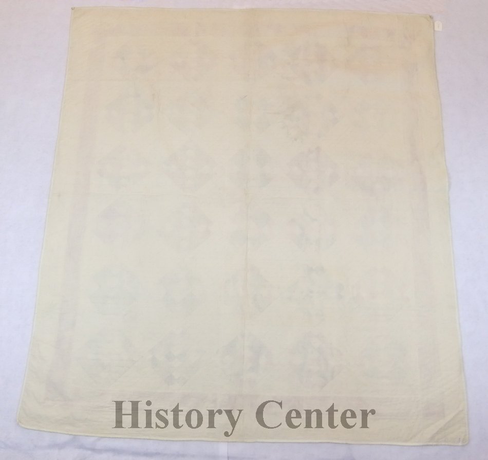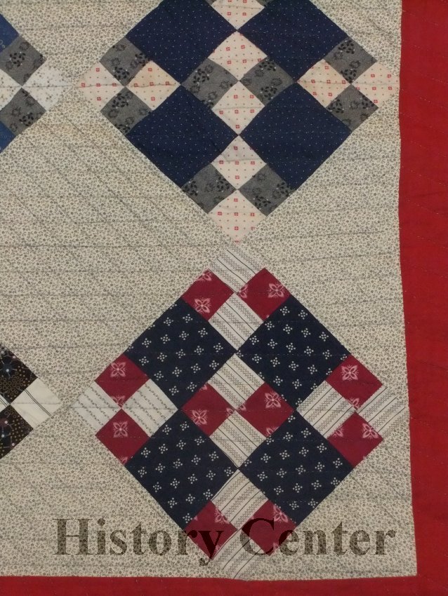 This quilt was made by the donor's great-grandmother, Wilhelmina Rolf Roesner c. 1880 and is completely hand stitched. Each pattern block is made up of nine smaller blocks and five of those nine blocks are made up of four even smaller blocks- hence the pattern name "Four Patch within Nine Patch."