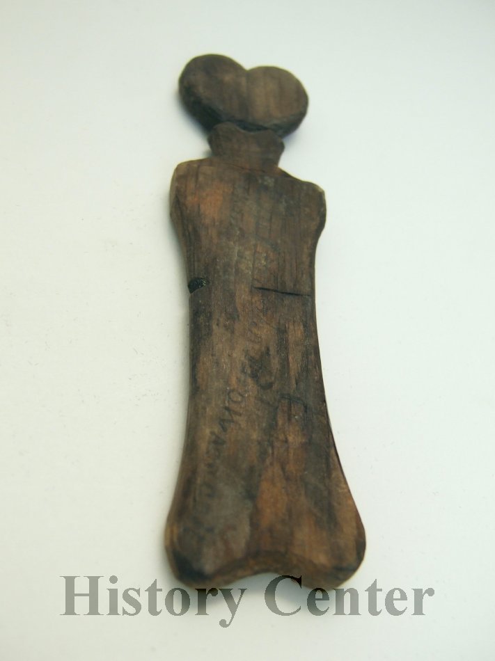 In ink directly on the wood is written "Out of John Brown's cell, Charleston, Va." This relic is said to have been carved from the wood of John Brown's jail cell. Brown, an uncompromising abolitionist, was wounded and captured in an attack he led on Harpers Ferry on October 16, 1859. He was moved to Charleston where he was later hanged on December 2, 1859.