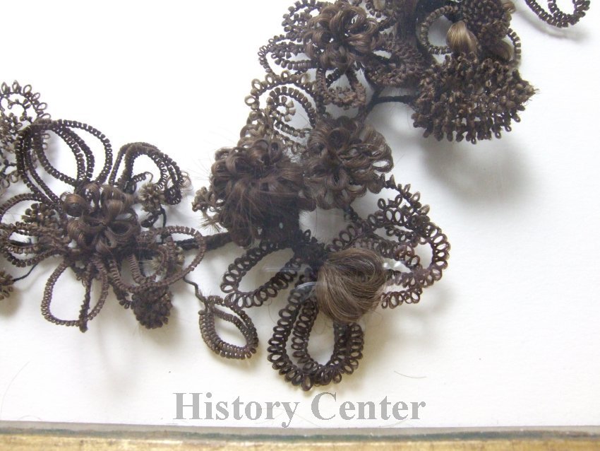 While not a travel token, Victorian hair wreaths would have also adorned the walls of middle and upper-class homes showing off the women's fancy work. Hair wreaths and jewelry also make up a portion of the more curious objects in our collection. Wreaths could include hair from living friends and family or from deceased loved ones to serve as a remembrance of them. Hair jewelry was also a popular form of personal adornment and tribute to the deceased.